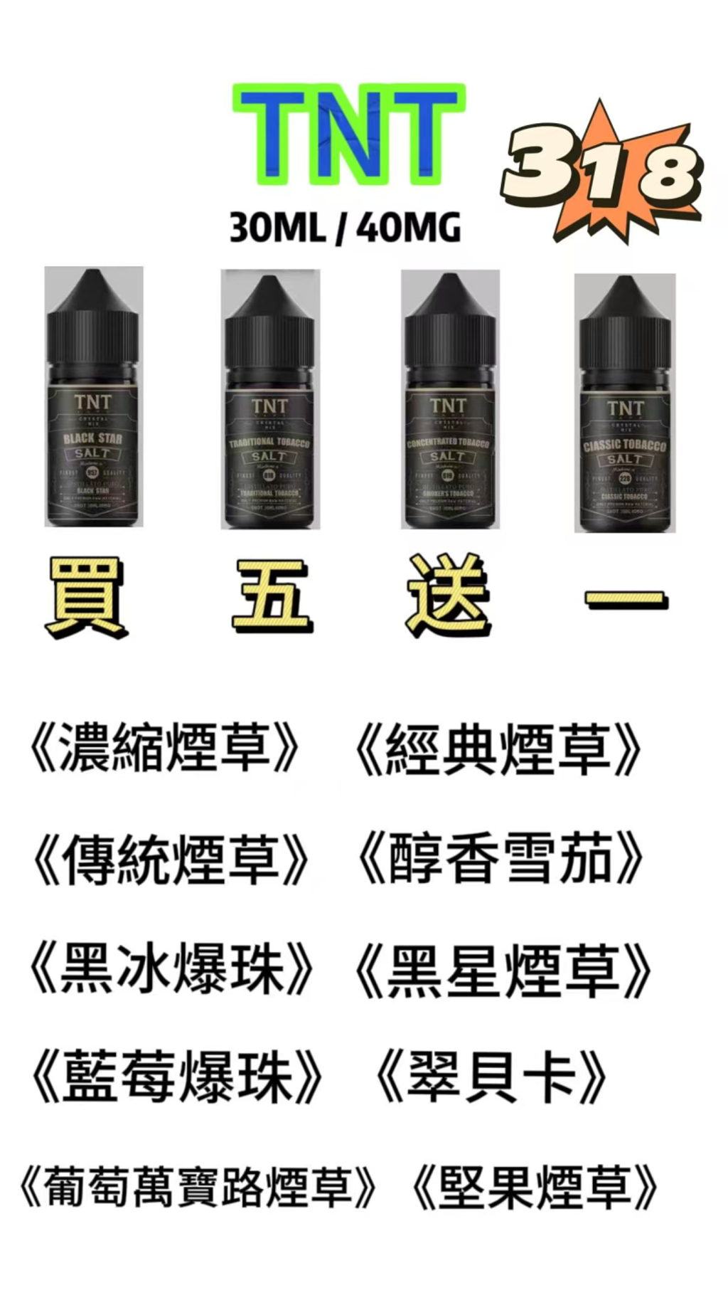 買五送一!現在購買TNT電子煙油,任選五瓶即可免費獲得一瓶,數量有限,錯過不再有!趕緊把握機會,體驗TNT帶來的經典菸草風味。